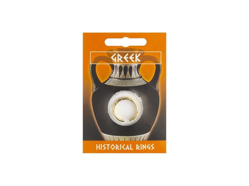 Pozlátený cínový grécky prsteň s klasickým dekorom kľúča je zabalený do priehľadnej kapsuľky a dodáva sa spolu s informačnou kartičkou s popisom šperkov v časoch starovekého Grécka.