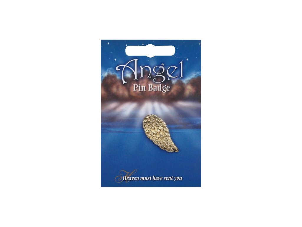 Pozlátený cínový odznak - anjelské krídlo sa dodáva so zapínacou sponou. Na prednej strane informačnej kartičky je jeden z troch výrokov - požehnaní a na zadnej strane je popis, kto sú anjeli.