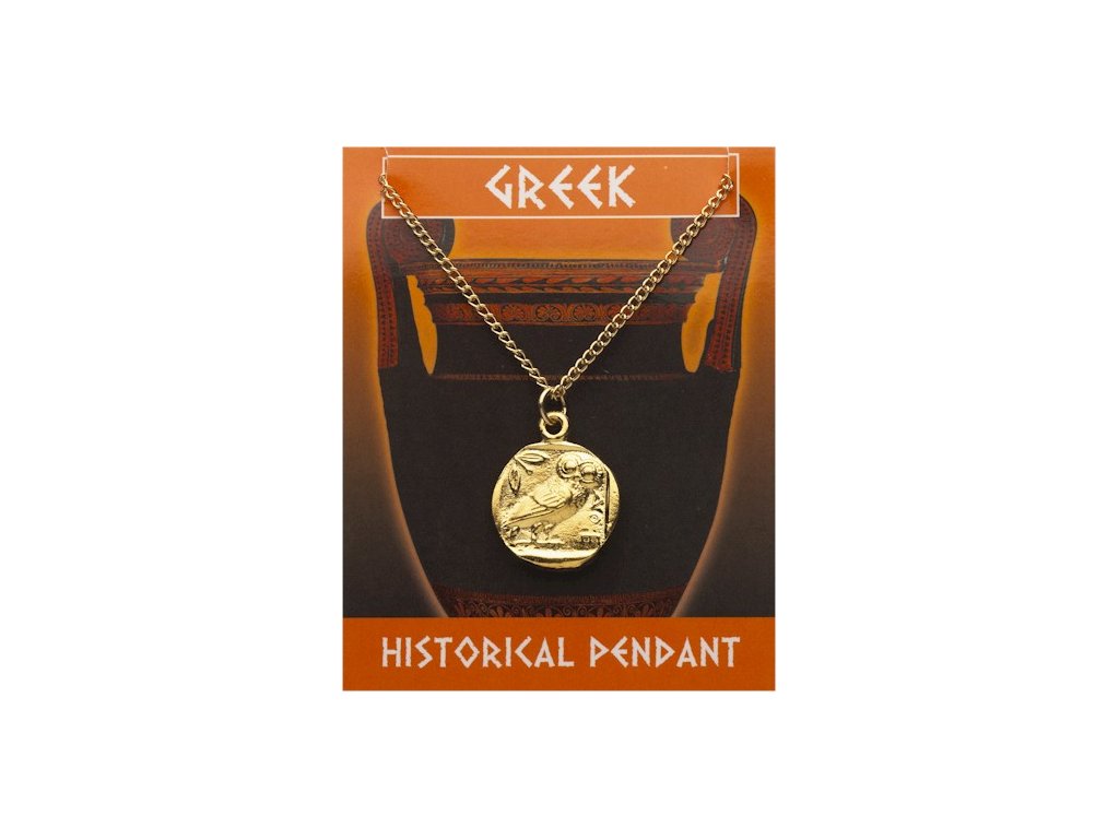 Pozlátený prívesok - kópia gréckej mince so sovou sa dodáva so zlatou retiazkou. Na informačnej kartičke je vysvetlenie ako sa grécka mytológia premieta do dizajnu gréckych šperkov a mincí.