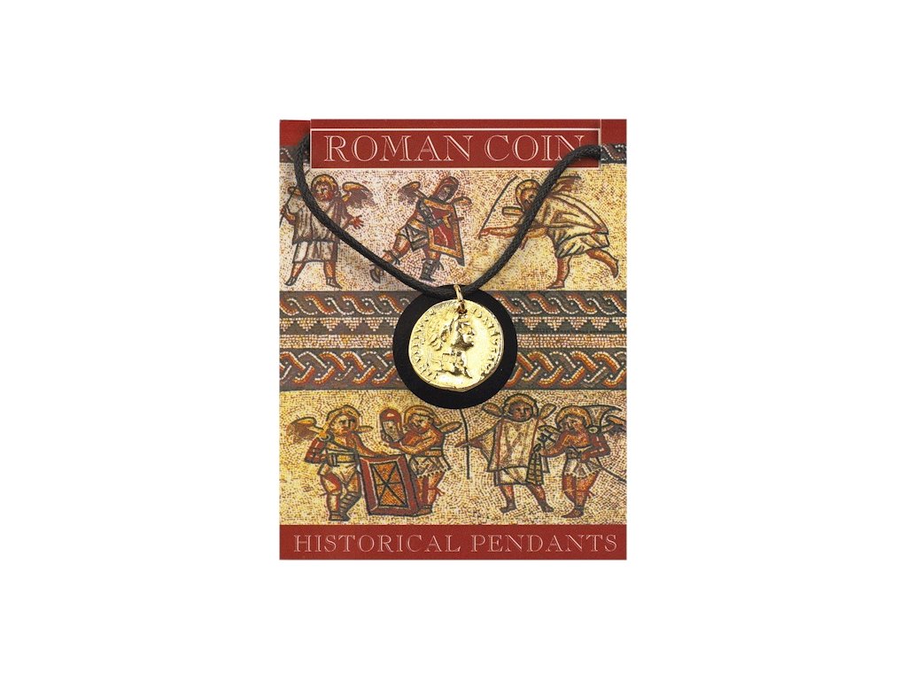 Pozlátený cínový prívesok - kópia mince Aureus sa dodáva s povoskovanou šnúrkou. Na informačnej kartičke je vysvetlenie ako sa mince používali na oznamovanie správ a udalostí.