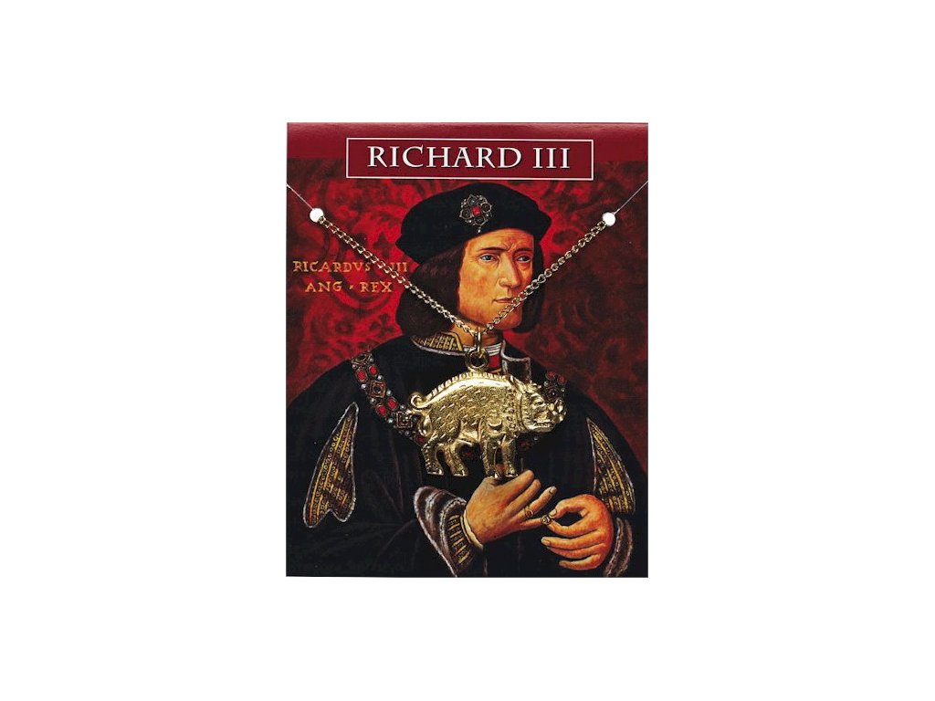 Pozlátený cínový prívesok - kópia emblému kanca Richarda III. sa dodáva na pozlátenej retiazke. Na zadnej strane informačnej kartičky sú historické informácie o vláde Richarda III., jeho embléme kanca a vyrazených minciach.