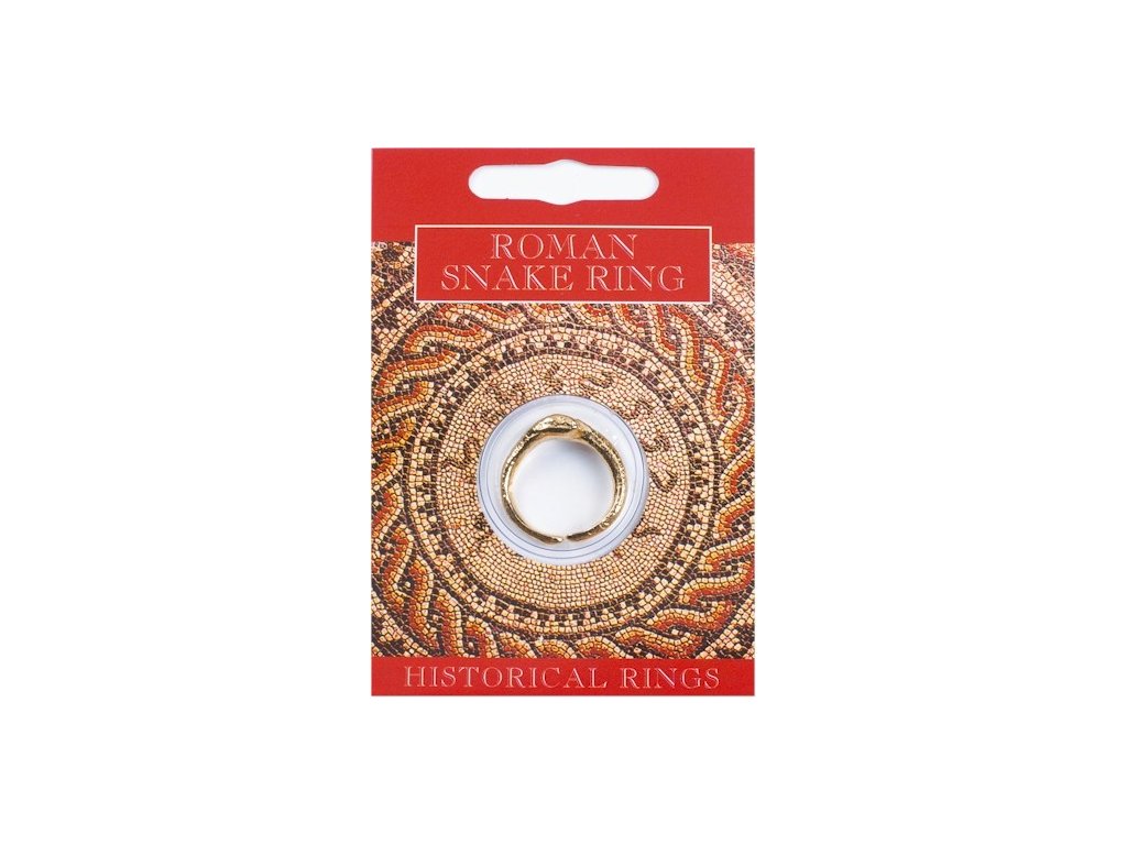 Pozlátený cínový prsteň - dvojhlavý had je zabalený do priehľadnej kapsuľky a dodáva sa spolu s informačnou kartičkou s popisom prečo dizajn hada bol obľúbený počas existencie Rímske ríše.