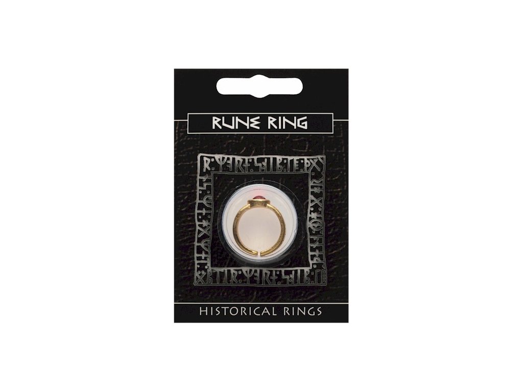 Pozlátený cínový prsteň s vikingskými runami a kameňom je zabalený do priehľadnej kapsuľky a dodáva sa spolu s informačnou kartičkou, na ktorej je vikingská runová abeceda s vysvetlením jednotlivých runových symbolov.
