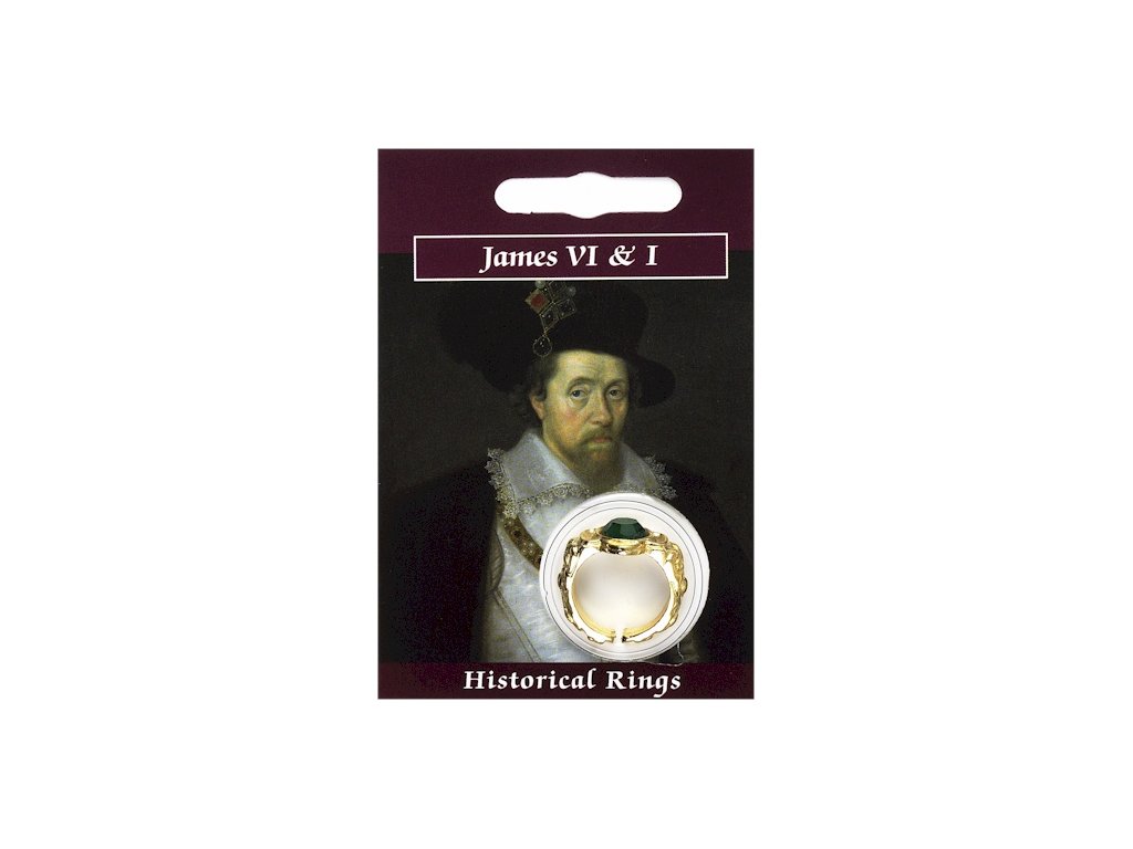 Pozlátený cínový prsteň škótskeho kráľa Jakuba VI. ( Jakub I.) s kameňom je zabalený do priehľadnej kapsuľky a dodáva sa spolu s informačnou kartičkou s popisom šperkov z obdobia vlády Stuartovcov a života škótskeho kráľa Jakuba VI.