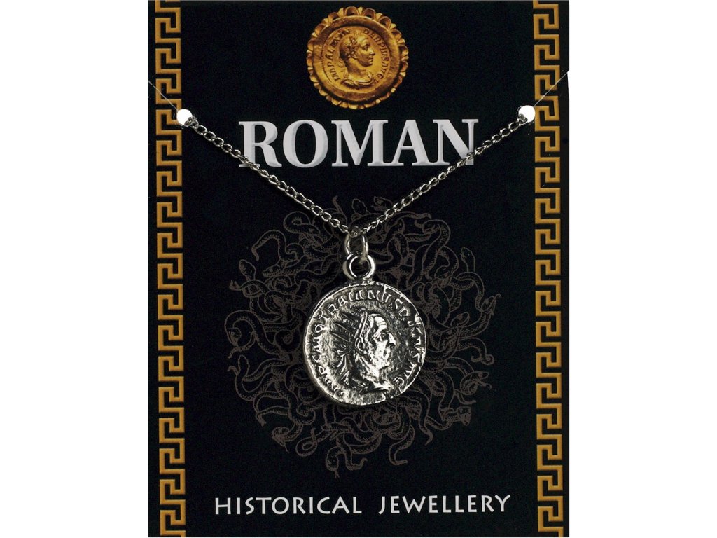 Táto reprodukcia Trajanskéj rímskej mince je vyrobená z bezolovnatého cínu, ktorý je dodávaný so striebornou retiazkou.