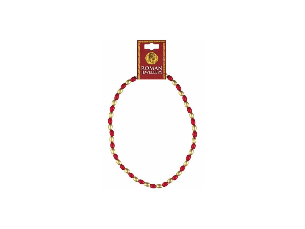 Náhrdelník inšpirovaný starorímskymi šperkmi. Náhrdelník je zložený z drevených korálikov červenej a zlatej farby a dodáva sa s informačnou kartičkou.