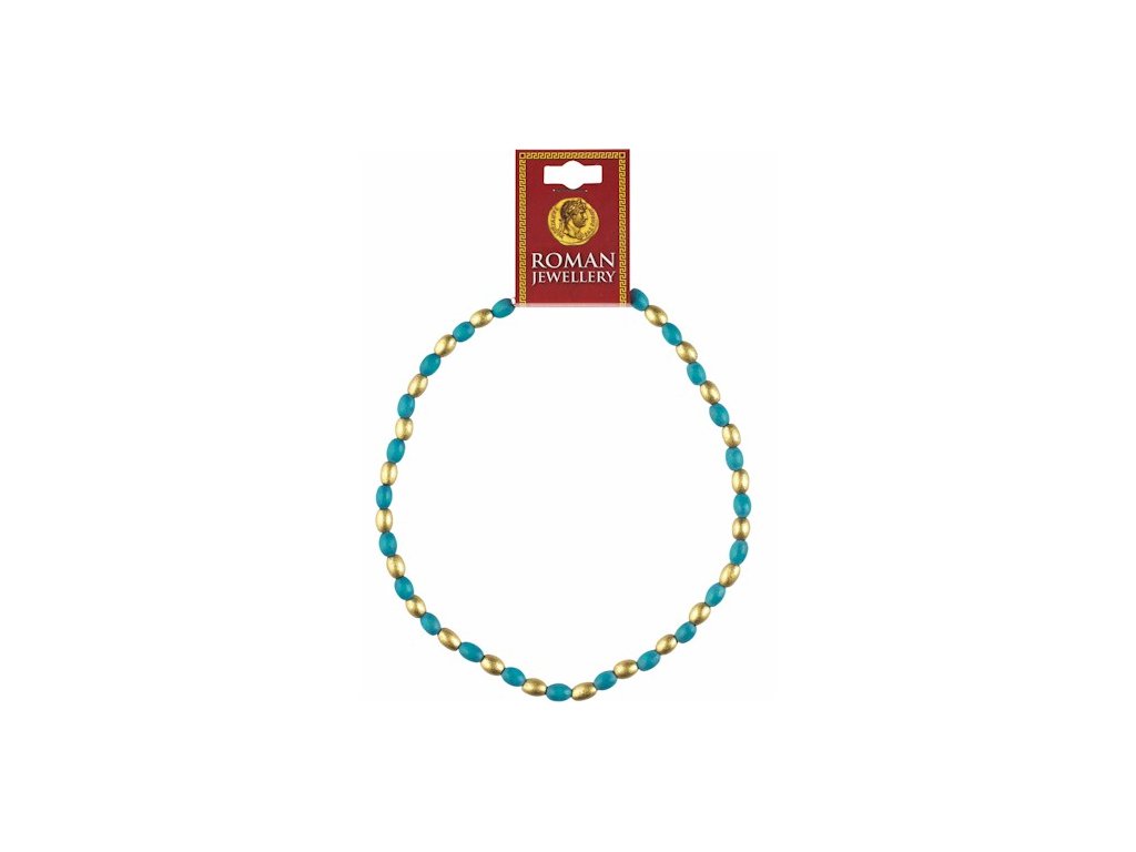 Náhrdelník inšpirovaný starorímskymi šperkmi. Náhrdelník je zložený z drevených korálikov tyrkysovo modrej a zlatej farby a dodáva sa s informačnou kartičkou.