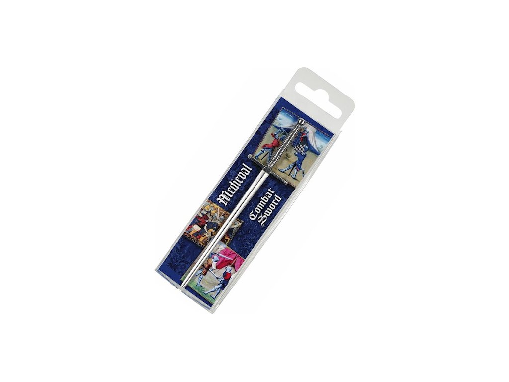 Cínová reprodukcia stredovekého bojového meča. Dodávané v priehľadnej krabici s farebnou vložkou popisujúcou históriu stredovekého bojového meča.